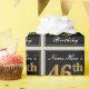 This simple and elegant wrapping paper design features a personalized message like "Name-Here’s 46th Birthday" (with the "46th" having a faux/imitation gold-like coloring look) within a black-colored square area featuring a simple border outline. The name is in an elegant white-colored script-like text, and can be personalized. Wrapping paper like this could perhaps be used when wrapping birthday gifts for somebody who is celebrating their forty sixth birthday. [~Z0000217]