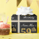 This simple and elegant wrapping paper design features a personalized message like "Name-Here’s 59th Birthday" (with the "59th" having a faux/imitation gold-like coloring look) within a black-colored square area featuring a simple border outline. The name is in an elegant white-colored script-like text, and can be personalized. Wrapping paper like this could perhaps be used when wrapping birthday gifts for somebody who is celebrating their fifty ninth birthday. [~Z0000217]
