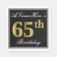 This simple and elegant paper napkin design features a message like "ANameHere’s 65th Birthday" (with the "65th" having a faux gold-like coloring) within a black-colored square area featuring a simple border outline. The name is in a white-colored script-like text, and can be personalized. Napkins like these could perhaps be used at a birthday party for somebody who is celebrating their sixty fifth birthday. [~Z0000136]