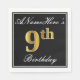This simple and elegant paper napkin design features a message like "ANameHere’s 9th Birthday" (with the "9th" having a faux gold-like coloring) within a black-colored square area featuring a simple border outline. The name is in a white-colored script-like text, and can be personalized. Napkins like these could perhaps be used at a birthday party for somebody who is celebrating their ninth birthday. [~Z0000136]