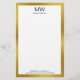 A large black monogram is at the top. A line of black display text is under the monogram for the name. Two lines of black display text are at the bottom. You can edit that text to show contact information such as a phone number, email address, and street address. All text can be edited or deleted. This professional stationery has a faux gold border. (The border is not made of foil.)