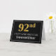 The front of this elegant and fancy birthday greeting card design features a large ordinal number "92nd" having a faux/imitation gold inspired appearance, the message "HAPPY 92ND BIRTHDAY,", a customizable recipient name, and a border pattern consisting of thin lines on a black colored background. The inside features a customized birthday greeting message, or could perhaps be cleared and left blank if a message is to be written by hand instead. A customizable birthday greeting card like this might be an elegant way to send birthday greetings to somebody who is celebrating their ninety-second birthday. [~Z0000464]