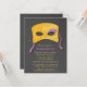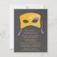It is time for a masquerade! This invitation has a fanciful gold mask with intricate details on it and touches of purple like the ribbon and lash. The colour of the masks contrasts nicely with the dark grey background and there are sparkles around it. Besides a masquerade ball, it is great for Mardi Gras or carnival themed parties! Suitable for corporate functions or school graduation balls. Personalise easily with your party details! Note that the gold in this invite is digitally created and hence does not shine.