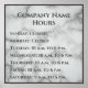 This elegant faux marble poster has dark gray display text that you can replace with the correct information. At the top, there's a line of large gray display text you can replace with your business name. The next line says "Hours" (you may change if desired). Under the two lines of large gray text, there seven lines of smaller gray text for each day of the week. You can change the hours for each day, if necessary.