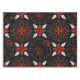 Intricate black background with a symmetrical floral pattern in red, white, and gold. Curved lines and dots add detail, creating an elegant, festive feel.