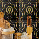 Presenting a refined ceramic tile design adorned with artfully arranged geometric shapes in faux gold, gracefully complemented by sparkling accents, all set against a backdrop of deep black.
