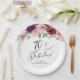 Elegant paper plates for her 70th birthday party featuring "70 & Fabulous" in a stylish script and watercolor bouquets of burgundy red, blush pink and purple florals with sage greenery.
