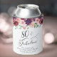 Elegant 80th birthday party can coolers with "80 & Fabulous" in a calligraphy script and watercolor bouquets of burgundy red and blush pink florals with sage greenery.