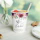 Elegant paper cups for her 80th birthday party that feature "80 & Fabulous" in a stylish script and watercolor bouquets of burgundy red, blush pink and purple florals with sage greenery.