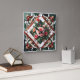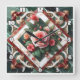 A beautifully crafted floral arrangement features roses and other flowers in a striking diamond pattern against a rich green background.