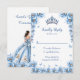 Complete your Quinceañera suite with this elegant dusty blue RSVP card, featuring watercolor floral borders, delicate butterflies, and a regal silver-blue tiara. Designed to match our princess-themed Quinceañera invitations, this card allows guests to respond in style while complementing your celebration’s graceful aesthetic. Perfect for a floral dusty blue or Cinderella-inspired Quinceañera theme, with customizable fields for guest names, attendance, and reply date.