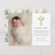 This elegant baby girl baptism or first communion thank you card design features a baby photo with stylish green, gold, and gray text that can be fully personalized, accented by a gold cross decorated with a beautiful garden floral arrangement of neutral white, blush pink, and cream colored rose flowers with green and gold greenery. The stylish green, gold, and soft black text can be fully personalized for your event. A light green background and coordinating floral pattern dresses up the back of the card.