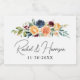 Beautiful wedding sparkling wine labels featuring a lush watercolor floral arrangement in peach, blue, and burgundy tones with greenery accents framing the couple's names in elegant script calligraphy and wedding date on a white background. A stunning personalized mini bottle favor for your wedding reception or bridal shower. All text is fully customizable.
