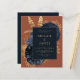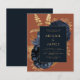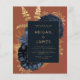 This elegant, moody wedding invitation features a lush, romantic floral bouquet in navy blue with gold faux foil and glitter foliage on a burnt orange background. Customize the gold-colored text in stylish fonts on a dark blue rectangle. The back of the card is solid dark blue.