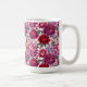Red Roses, pink peonies, and purple lilacs on a white background create a beautiful mug with a vintage look. A round badge with the border and center in complementary colors has space for your name and monogram.