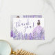 Send a heartfelt message of gratitude with this beautifully designed thank you card, featuring a soft purple watercolor floral theme. The front showcases an elegant and timeless look with delicate lavender and lilac-inspired blooms at the bottom, paired with subtle greenery. On the right, a brunette girl in a faux glitter purple ball gown and tiara adds a regal and whimsical touch. "Thank You" is displayed on the left in graceful purple script, creating a charming and sophisticated design.