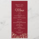 Elegant, modern red wedding menu with modern calligraphy script and gold floral lace.