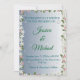 This elegant wedding invitation features a sophisticated silver-to-blue gradient background adorned with a delicate white and pink floral border. The design is accented with subtle bubble or dewdrop elements, creating a fresh and dreamy atmosphere. Perfect for spring or summer weddings, this invitation combines classic calligraphy with a modern aesthetic. Completely customizable with your own wedding details.