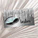 This gorgeous lashes & brows business card design features faux silver dripping glitter metallic texture, mint floral eyelashes and elegant calligraphy font.