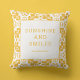 Elegant Floral Yellow Pattern Modern Custom Name Throw Pillow features a chic and sophisticated abstract floral pattern in yellow and white, creating a refined and festive look. The center showcases a white background with the phrase "Sunshine and Smiles" elegantly displayed above the family name, adding a warm and personalized touch.