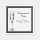 This retirement napkin exudes formal elegance with its deep blue background and off-white center, offering a classic appeal for any event. The tasteful mix of script and serif fonts complements the overall simplicity, while a champagne glass graphic adds a touch of celebration. Ideal for corporate or family parties, this napkin is easily customizable for your special event.