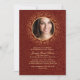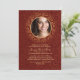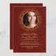 A formal and very elegant invitation for your confirmation celebration. The dark red background has abstract swirls and a gold, round photo window.