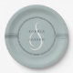These elegant wedding paper plates feature a round, dark blue gray frame surrounding your names, with matching geometric lines and modern text on a sea glass colored background. A minimalist and stylish design.
