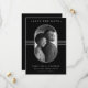 These elegant save the date cards feature a rounded silver frame surrounding your personal photo, with matching geometric lines and modern text on a black background.