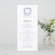 This Elegant French Roses Blue Monogram Crest Wedding menu card is perfect for your formal baroque style wedding, with a vintage floral shield and classic timeless typography.