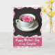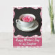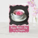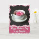 This design shows a white teacup and saucer with thin gold edging set against a deep black background, creating a quiet, intimate contrast. Inside the cup, a single fuchsia-pink flower floats on a dark drink, its soft petals spreading like a gentle gesture of affection ❤️. The lighting is soft and diffused, catching tiny highlights on the rim and making the porcelain look smooth and cared for, like a shared table moment. Around the scene, a pastel pink border curves along the edges and is dotted with small white flower shapes that feel sweet and friendly 🌼. Near the bottom, the border shifts into a wide, deeper-pink rectangle that serves as the message area. The main text sits centered in that lower panel in flowing white lettering, standing out clearly against the darker pink. Fine gold lines trace the cup and saucer rims, and the bright blossom remains the focal point in the dark liquid.