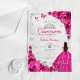 Fuchsia pink silver Quinceanera celebration acrylic invitation. Features brunette girl in ball gown dress, script font, silver butterflies, hot pink roses and tiara. Perfect for an elegant princess style glam celebration. Personalize with your own details. Stylish transparent or frosted acrylic invitations.