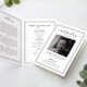 Funeral memorial program featuring on the front a photo of the deceased, thier name, dates, the memorial venue, date of the event, and elegant dark gray frame. On the inside is an obituary, and order of service; and on the back another photo, a thank you note and the second venue for after the funeral. For further customization, please click the "Edit using Design Tool" link and use our design tool to modify this template. If you need help or matching items, please contact me.