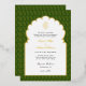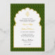 Elegant, chic Real gold foil invitation featuring traditional Ganesh in a golden arch with a dark green and gold paisley background, Perfect for Indian wedding.
