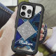 Elegant girly faux Glitter silver blue geometric squares iPhone 16 Case. To make it extra special, it is also monogrammed and personalized with name or initials or any text you like.