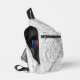 On this stylish sling bag is a white and silvery classic marble pattern with silver glittery streams for a backdrop with an elegant silver lotus flower design where in the front you can personalize it with a name or logo creating a zen vibe.