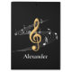 Perfect for music teachers, students, and musicians or any music lovers, this personalized music clipboard features an elegant design with black background, gold treble clef and stylized music staff with notes.