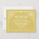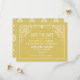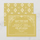 A bold and sophisticated save the date featuring an ornate art deco scrollwork frame in crisp white on a rich golden yellow background, with a coordinating damask tile pattern on the reverse. The structured typography and decorative flourishes give this design a timeless, formal elegance. All names, date, and venue details are fully customizable.