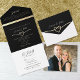 Simplify your wedding stationery with this elegant gold and black all-in-one invitation. Featuring a romantic gold rope heart, chic black-and-white design, space for a custom photo, RSVP section, and additional wedding details, this invitation blends modern convenience with timeless style. Personalize it easily to create a seamless, unforgettable first impression for your guests.