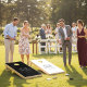 Natural Wood Cornhole Set, Hunter Green and Grey bags