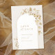 These elegant modern save the date cards feature an faux gold botanical floral illustrations, frame a delicate gold line in an arch shape. Your information appears in romantic script and sophisticated serif font. Great floral wedding invitations for romantic garden wedding, and modern luxe wedding.