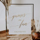 This elegant gold calligraphy games and fun poster sign is perfect for a simple wedding or bridal shower. The neutral design features a minimalist sign decorated with romantic and whimsical faux gold foil typography.