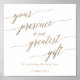 This elegant gold calligraphy your presence is our greatest gift poster is perfect for a simple wedding. The neutral design features a minimalist card decorated with romantic and whimsical faux gold foil typography.