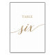 This elegant gold calligraphy table six table number is perfect for a simple wedding. The neutral design features a minimalist card decorated with romantic and whimsical faux gold foil typography. The card prints on the front and back (double-sided). Other table numbers in the collection are sold separately.