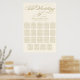 Elegant black calligraphy script wedding seating chart poster design features a monogram of the bride and groom names and wedding date and custom template text for nineteen (19) table numbers and guest names. Colors include ivory and champagne gold.