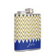 Elegant drinking flask done in a gold tone glitter and white chevron zigzag pattern, with blue accent, on the top, and a solid blue, on the bottom, of the flask. Personalize the white script text for yourself or as a lovely gift idea. Great for bridesmaid's gifts.
