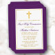 Plain white envelopes are included with paper invitations and will come to fit the invitation size you select. If you don’t need the envelopes, you may choose to not receive them by selecting the dropdown below "Envelopes" and choosing "None." If you’d like to have a design on your envelopes, you can browse all of these available envelopes to find the design that complements your Elegant Gold Cross Purple First Communion Invitation.