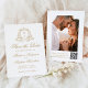 Share the excitement of your upcoming celebration with this elegant photo wedding save the date card. The design features a gold floral crest surrounding the couple’s monogram initials, with "Save the Date" beautifully displayed in coordinating gold calligraphy on a white background. Add your names, wedding date, and wedding location on the front. The reverse side highlights your vertical engagement photo with a scannable QR code beneath, guiding guests to your custom wedding website. With room for personalized instructions and important details, this classic and stylish card is a timeless choice for modern and elegant weddings.