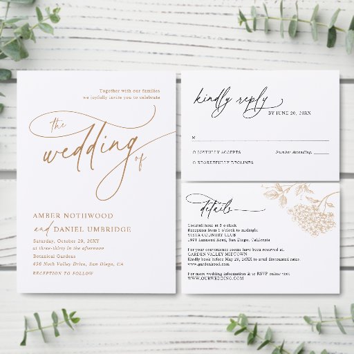 Having your Elegant Gold Floral Modern Script Wedding Invitation match the theme of your party is a great detail that your guests will appreciate. The thoughtfulness of a consistent party theme is often appreciated and can show your guests that you can host a cohesive event.