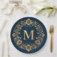 Ornate golden floral pattern encircles a bold letter 'M', design ideal for branding, invitations, or decorative purposes. The rich navy blue background enhances its luxurious and classic appearance.