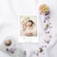 Modern birth announcement card with a simple design featuring a vertical photo of your newborn baby boy or girl along with "thank you" in an elegant script and baby's name below. All text on the front is in real gold foil. The back has a second picture and your personalized message. This minimalist style announcement card is the perfect way to announce your new baby to all of your loved ones.